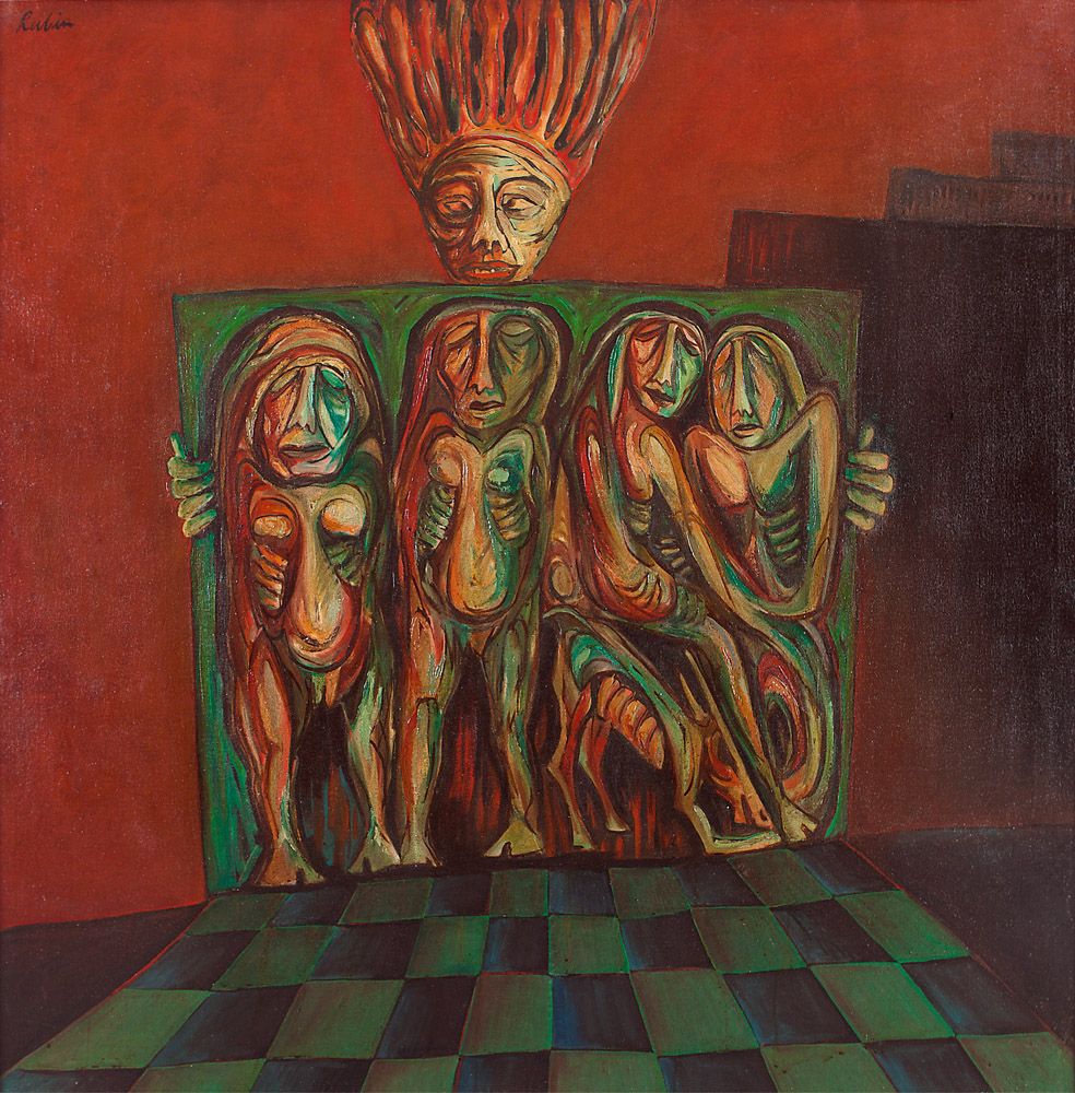 Shown at the Shanghai Biennale, exhibited in New York, widely admired for his consistency throughout his career, Rabin Mondal’s excoriating paintings are a savage indictment of social and political ills. A reticent, reserved artist, Mondal’s works offer a scathing commentary on the pursuit and abuse of power. A primal, primordial figuration describes his work in which people in positions of authority are rendered vulnerable because of the very power they aspire to. Their contorted features and clawed hands and feet represent their venality. Strong outlines, naked brushstrokes and potent use of green and red characterise most his work.