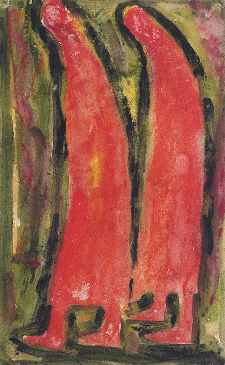 Gobardhan Ash enrolled in the Government College of Art in 1926 and, deeply disillusioned by the curriculum, dropped out and joined the Madras School of Art to train under the mentorship of Devi Prosad Roychowdhury. Ash responded to the turbulence of the Bengal Famine with a series of rusty brown washes, which hovers somewhere between the gritty documentation of Chittaprosad and the abstract energy of Somnath Hore. Drawing from the vocabulary of Primitivism, Ash painted several portraits and figures, where the subjects have been reduced to their mere contours. In this image, we see the silhouettes of two figures. The artist has filled the silhouettes with a block of red. One of them has its feet slightly raised, suggesting motion and their shape suggests that they might be wearing long travelling cloaks.