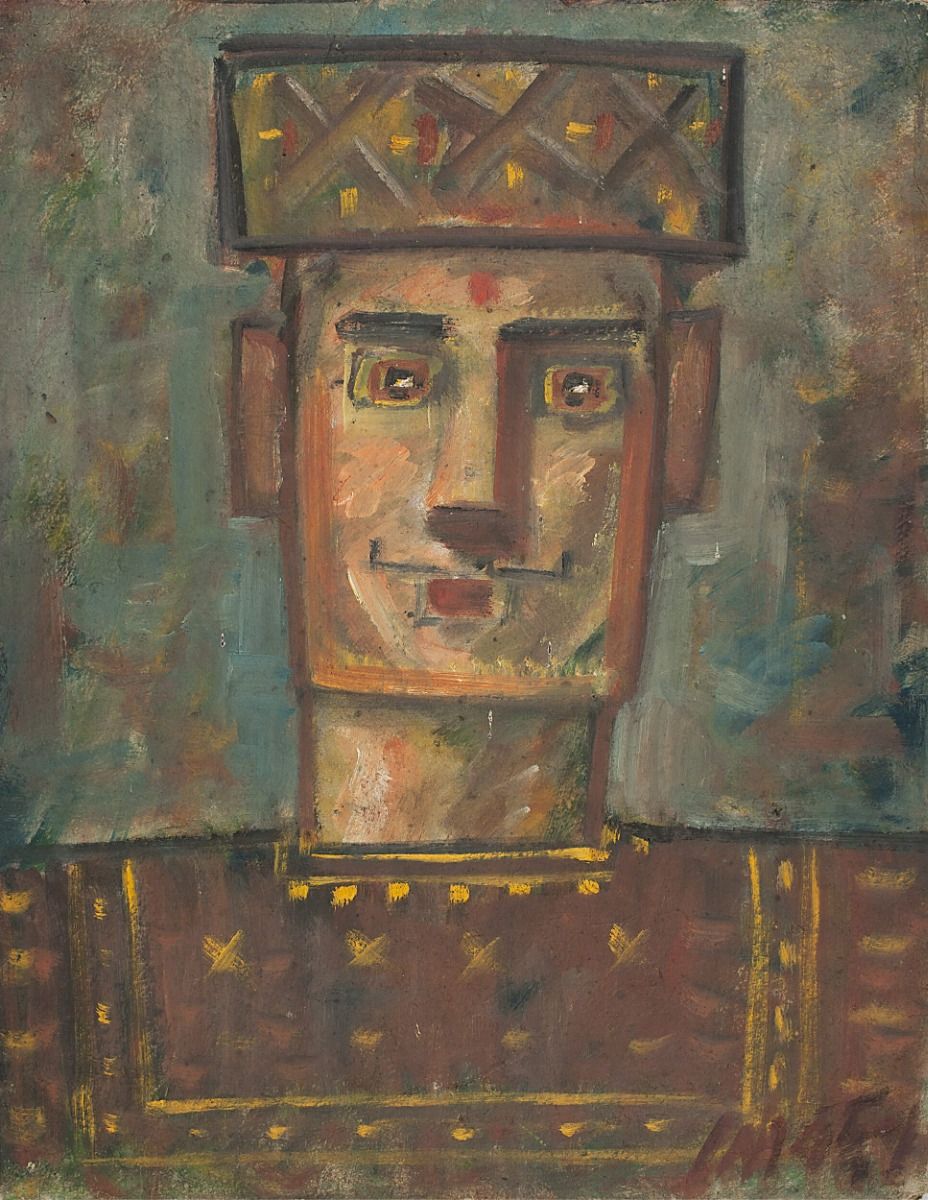 Gobardhan Ash enrolled in the Government College of Art in 1926 and, deeply disillusioned by the curriculum, dropped out and joined the Madras School of Art to train under the mentorship of Devi Prosad Roychowdhury. Ash responded to the turbulence of the Bengal Famine with a series of rusty brown washes, which hovers somewhere between the gritty documentation of Chittaprosad and the abstract energy of Somnath Hore. He drew many self-portraits to record the subtle changes in his personality. From the 1940s onwards, he adopted gouache as a medium. In this portrait, we see a well-groomed man staring back at us—the use of concentric squares makes his eyes appear somewhat eerie.