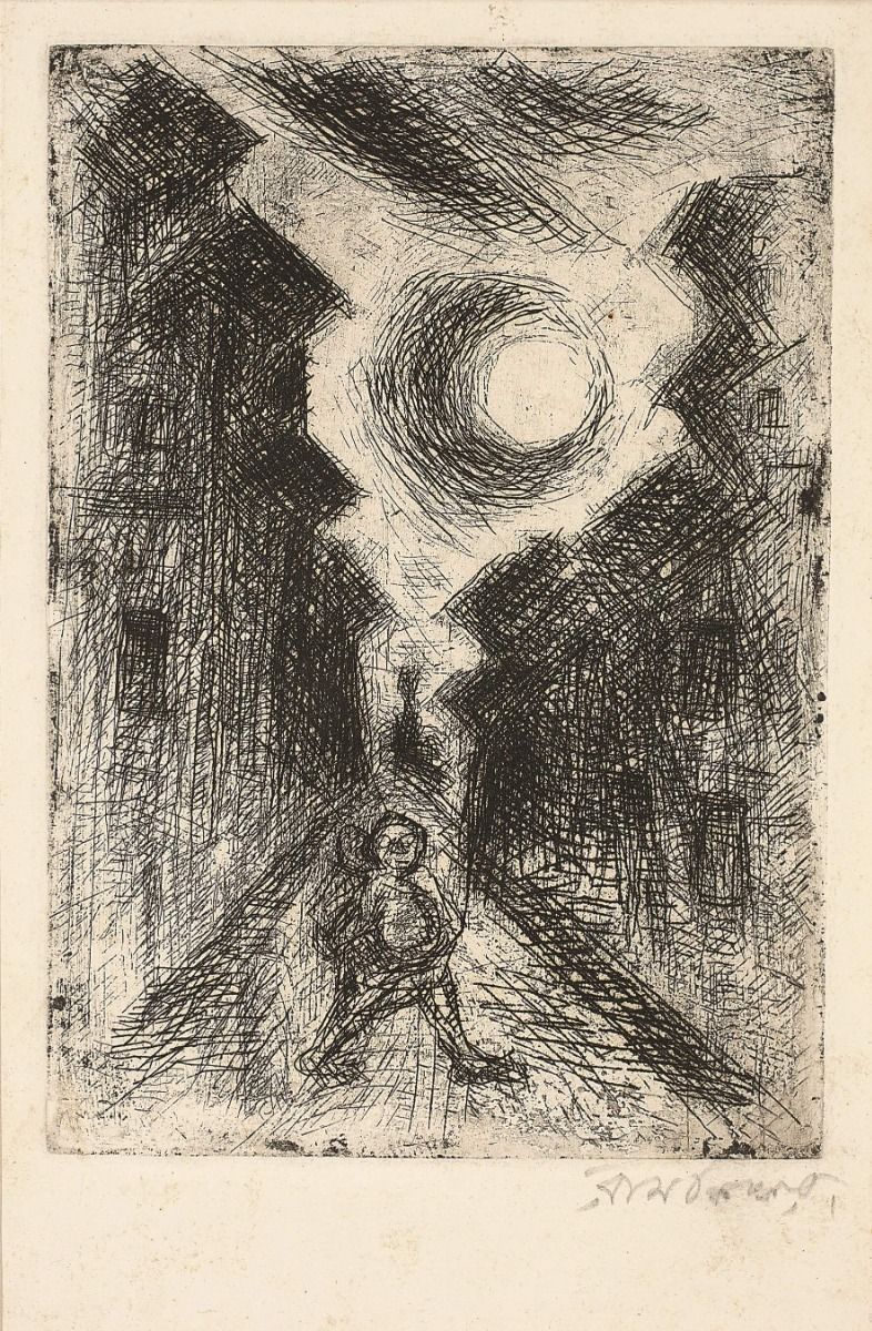 Ramkinkar Baij is one of the most important modernist artists of the twentieth century. He made sketches, paintings, etchings and drawings, but is perhaps best known for the sculptures he developed at Kala Bhavana, which was the fine arts department of Visva-Bharati University, established by the Nobel laureate Rabindranath Tagore. He learned from artists like Nandalal Bose and later became a member of the faculty himself. In his smaller etchings, like the one here, he attempted to convey the mood of a setting or the intimacy of a close encounter. The crepuscular world of the street-scene is dominated by the eye of the moon in the background, conveying a sense of both danger and surreptitious freedom under the cover of darkness.
