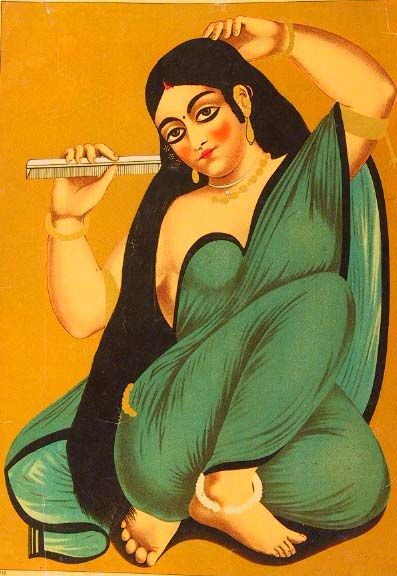 Around the 1890s, numerous printmaking studios were established in Calcutta, each working with different artists to produce images on the same theme. Among them, paintings of Sundaris (‘beautiful women’), which featured sensual portrayals of courtesans, became popular. Texts like An Educated Woman in Prostitution offer frank glimpses into the lives of cultured courtesans like her, who were expected to entertain with music, poetry recital and other arts. The figure in this lithograph is engaged in a typical act of grooming—by combing her hair.