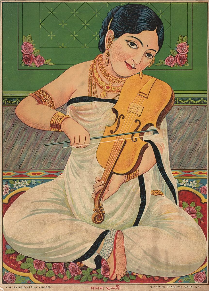 Around the 1890s, numerous printmaking studios were established in Calcutta, each working with different artists to produce images on the same theme. Among them, paintings of Sundaris (‘beautiful women’), which featured sensual portrayals of courtesans, became popular. This Manada Sundari, for example, was printed at the The Kansaripara Art Studio, Calcutta, India, and illustrated by a different artist. The figure is characterised by a rounded face and the exaggerated proportions cause the violin to appear disproportionately larger. She was one of the most popular recording artists of her time as well. The artist has also paid close attention to the tiles on the ground, which gradually recede and reduce in size before ending at the purple wall.