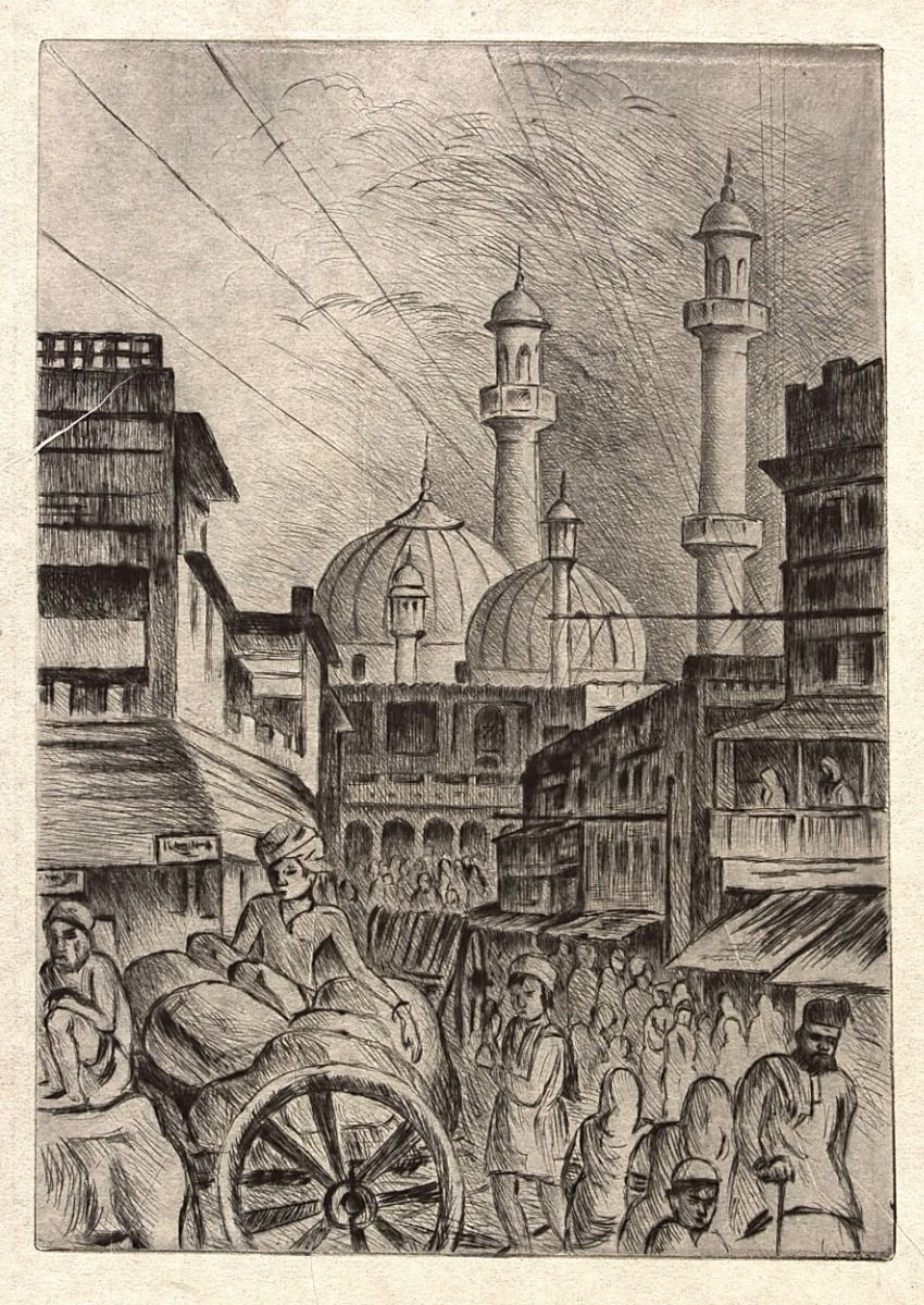 Ramendranath Chakravorty was trained in etching, aquatint and drypoint from the famous printmaker Muirhead Bone, known for his work as a war artist in both the First and the Second World Wars. In 1943, he became the Principal at the Government School of Art, Calcutta and introduced graphic art into the curriculum of the school. Chakravorty’s prints display a confluence of artistic traditions—from the Santiniketan School, especially the woodcut prints of Nandalal Bose, and European idioms like pointillism and Impressionism. In this image, we see a crowded Nakhoda Masjid in the Chitpur area of North Kolkata, Bengal. Though the subject of the image is the masjid, we see a mass of pedestrians in the foreground and a row of buildings on both sides and just a portion of the masjid in the background. Even while documenting a monument, the artist seems to be more interested in capturing the life around it to convey a physical sense of navigating one’s way to the masjid through the narrow lanes of Chitpur.