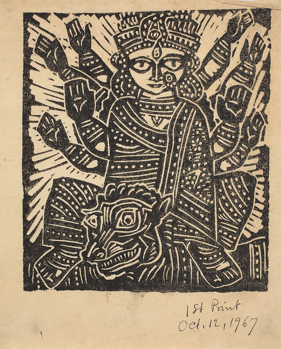 Chittaprosad is one of the most important Indian artists of the twentieth century. He is best known for his documentation of the 1943 Bengal famine, which was one of the worst man-made disasters in history that killed millions in India during the Second World War, while India was still under British colonial rule. Though best known for his documentation of the famine, an entire body of Chittaprosad’s work is dedicated to mythological themes and popular folktales, which the artist has explored in both prints and paintings. A first print taken from a freshly engraved lino-plate, this work is of an ashtabhuja or eight-armed Durga. Instead of a warrior goddess, she appears as a mother figure to bless her devotees with extended palms.