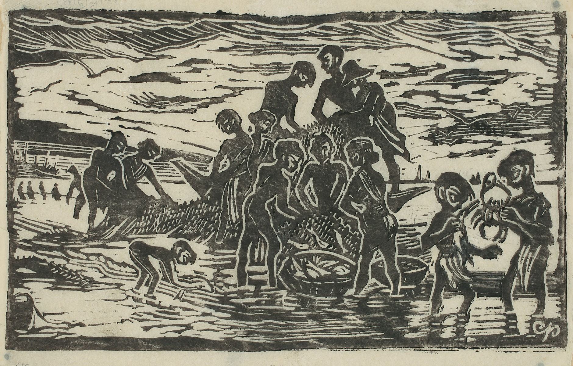 Volunteering for the Communist Party of India’s relief efforts, the prominent left-wing artist Chittaprosad extensively toured rural Bengal to document the devastation wreaked by the man-made Famine of 1943. This lino print depicts a group of emaciated people huddling around a fishnet, while some children stand examining a freshly captured crab. Chittaprosad’s rough black strokes convey the rhythm of labour—the motion, sweat and grind of people hauling the fishnet.