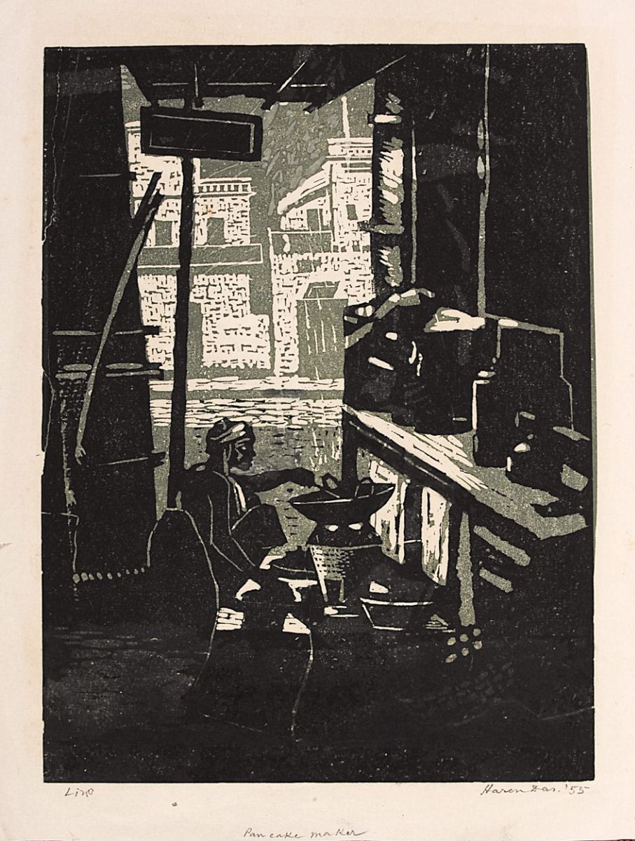 Haren Das was a prominent printmaker and master of academic naturalism, and unlike his contemporaries who were moving away from realism, he remained faithful to this style throughout his artistic career. Das was among the many refugees, who moved from a semi-rural life in erstwhile East Bengal to Calcutta (now Kolkata) during the Partition of 1947 and struggled to build a life for himself in the city. In this linocut, we see a ‘pancake-maker’ stirring something in a giant cauldron. Through his shack we see a row of buildings, suggesting that this is one of the many roadside food joints that the people of the city frequented for cheap meals and snacks.