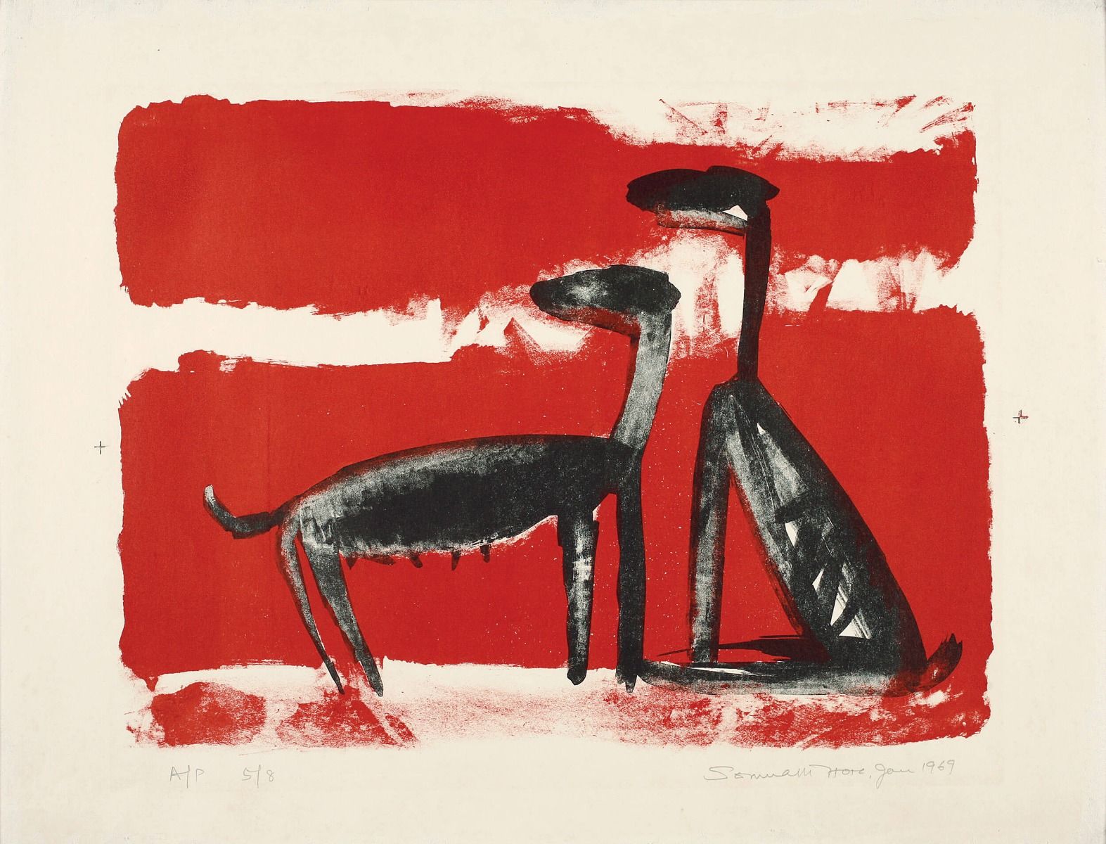 Studying briefly at the Government School of Art, Calcutta (now Kolkata), in the mid-1940s, Somnath Hore trained under the artist Zainul Abedin, and, later, the printmaker Safiuddin Ahmed. Hore chose a distinctly formal, Western style of artmaking, distinguished by its strong linear quality, and guided by humanist concerns as much as the need to depict the catastrophe-enduring figure. The 1943 Bengal famine and 1946 Tebhaga peasant uprising marked him, reappearing constantly in his works. Made between January and April of 1969, this artwork, the first of three prints, uses blacks, greys and reds to describe the squalor and unrest the artist witnessed within the city. A pair of dogs look as if they have been startled by a sound in the distance, reflecting the anxiety that had soaked even into the animal inhabitants of the city during the tumultuous decade of the 1940s.