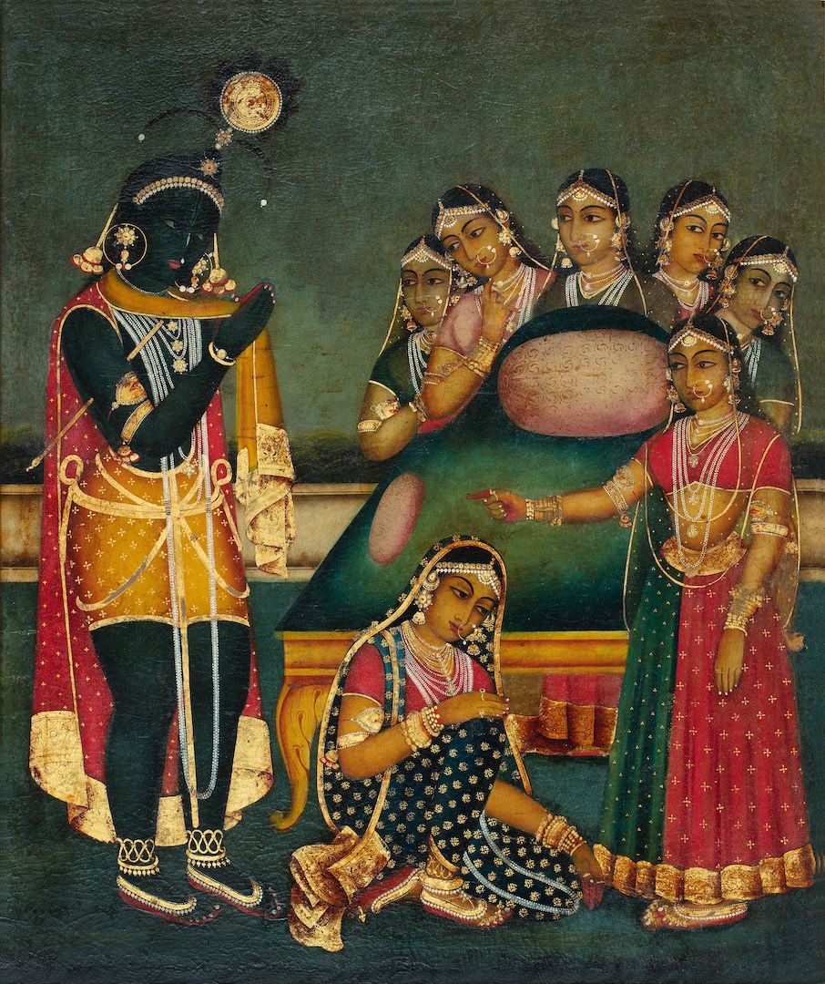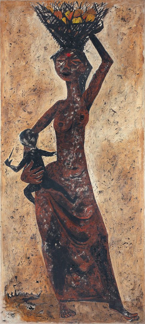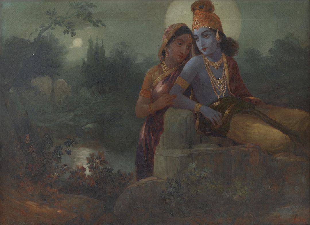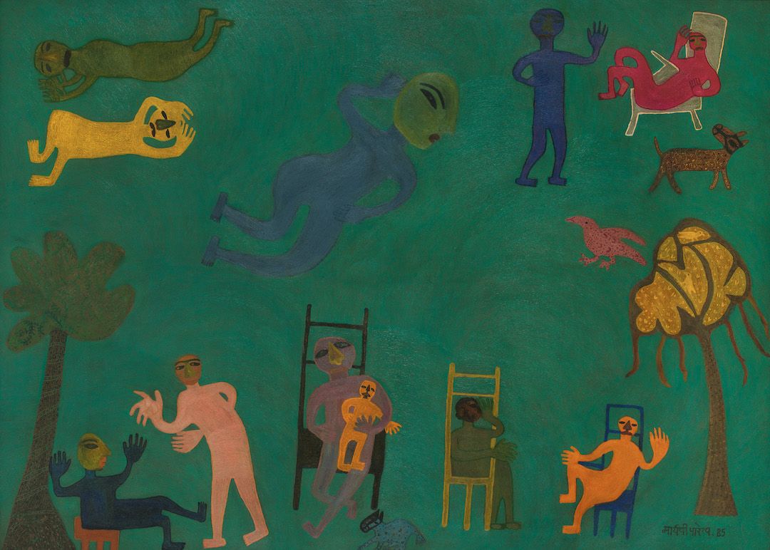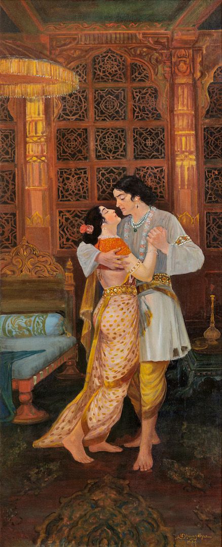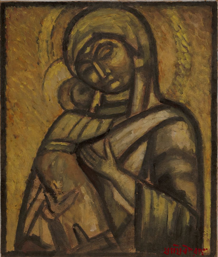 Among the works on view are a superlative family portrait by Raja Ravi Varma—widely recognised as his first ever commissioned painting, making it the first painting ever of modern Indian art; rare works by other National Treasure artists such as Abanindranath Tagore, Nandalal Bose, and Sailoz Mookherjea; lyrical poetic compositions by masters who would go on to be leading lights of art in Pakistan—Allah Bux and M. A. R. Chughtai; Western interpretations of early India through the eyes of Thomas Daniell, and a later work in the genre by Edwin Lord Weeks; a fine Early Bengal work by an unknown artist on Krishna and Radha; a divine love story in the realistic style by M. V. Dhurandhar; an unusual mother-child painting inspired by Christian iconography by Jamini Roy; path-breaking experiments in abstraction by Prabhakar Barwe, S. K. Bakre, Shanti Dave, and Sohan Qadri; a representative work from his important Boitorini series by Nirode Mazumdar; peak career works by the Progressives and their adherents such as F. N. Souza, M. F. Husain, Krishen Khanna and Ram Kumar; a sculpture by early modernist Dhanraj Bhagat; and a unique indigenist canvas by Madhvi Parekh featuring her signature playful figures.