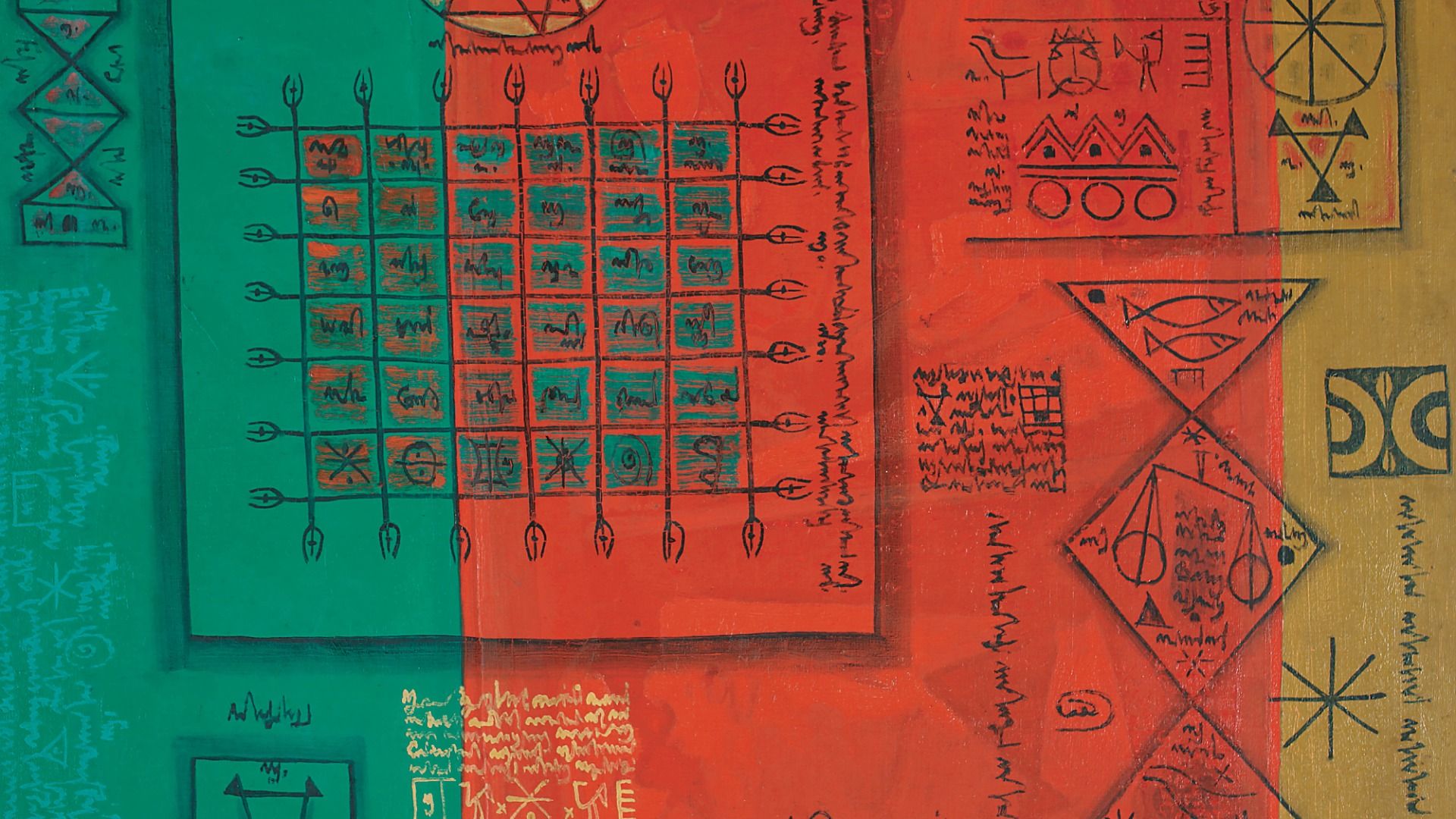 His painting Lumbini or Life of Buddha marks his departure towards an increasingly philosophical disposition, using iconographic symbols