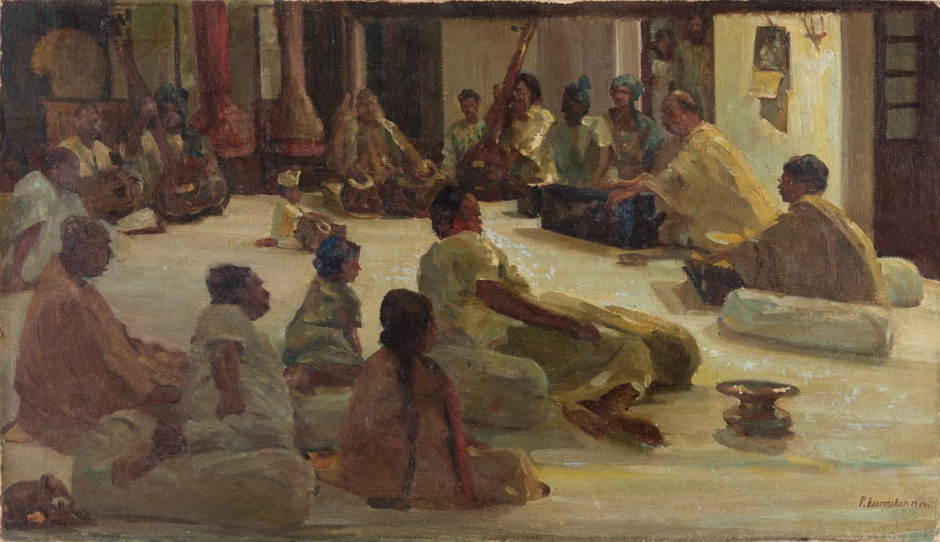 Prahlad Karmakar was a classically trained studio artist from Calcutta (now Kolkata), best known for painting realistic scenes. This untitled artwork shows a music concert, perhaps one that began late in the evening. Audience members lie sprawled in the music room while musicians playing the harmonium, tambura and tabla occupy centre stage. The viewer of the painting assumes the position of an audience member, who is witnessing the performance from a corner of the room.