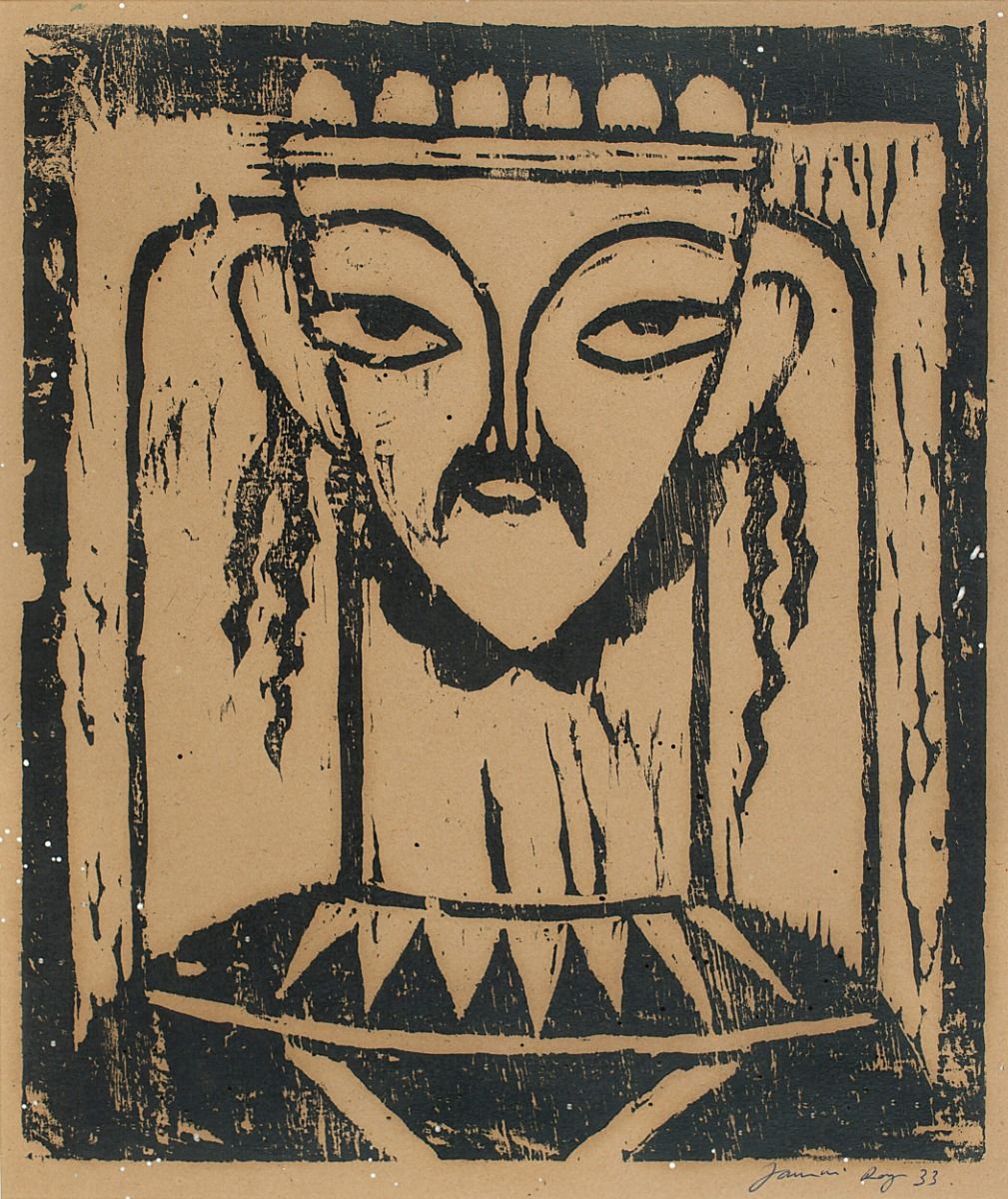 Jamini Roy was one of the most iconic artists of twentieth century Bengal. He consciously moved away from his formal academic training to adapt the languages of folk art and fashion himself like a karigar or artisan, who uses symbols from a familiar repertoire of shared stories. To Jamini Roy, ‘folk’ meant an entire gamut of visual expressions, including the home sewn quilt (called kantha) and ritual floor paintings (called alpona). Besides folk deities, Jamini Roy was also fascinated by Christian themes, producing hundreds of works featuring Christ, his birth, or scenes of the Madonna with her child. Many of them were reworked into a rural Bengali setting. In this woodcut that reveals his characteristic, emphatic line he renders the crowned figure of Christ with his face shaped like a conical vessel. Pronounced eyebrows merge with the nose, and the eyes, while drawn large, do not stray out of the face.